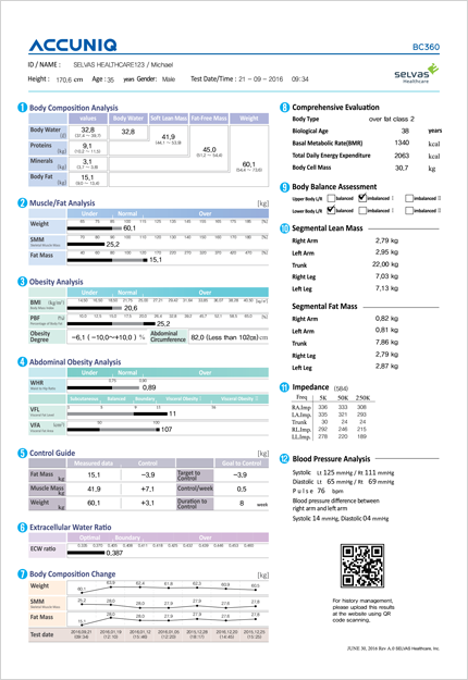 Body composition analyzer ACCUNIQ BC720 ACCUNIQ BC380 ACCUNIQ BC360 ACCUNIQ BC310 ACCUNIQ BC300 ACCUNIQ BC250 Contact Plus X-Contact MANAGER Body Composition Analyzers Studies comparing Accuniq with the gold standard for body watermeasurement show extremely high accuracy (correlation coefficient R=0.97)Reappearance Rate (correlation coefficient R=0.99)Source: Validity of total body water in impedance (X-SCAN) ACCUNIQ BC360 With the development of our basic technology that more accurately measures your bodies data our impedance body fat analyzer can truly analyze body composition. Characteristic Specifications Communication Result Sheet Characteristic Product details · Frequency range: 5, 50, 250 kHz· Measurement site: Measurement by whole body, site (right arm, right leg, left arm, left leg, body)· Size: Body 414 X 636 X 980mm (W x D x H ± 10mm)· Measurement mode: Body scale mode / Body composition mode· Various results: Body composition result, pediatric result (optional)· QR code: Scan the QR code of the LCD and result sheet to send and check the measurement result to the management website OPTION Consulting program Ultasnoic Height Meter BP Monitor Ankle electrode Segmental/Result sheet for children Thermal Printer Bluetooth Optional parts and software not considered to be medical devices. Developed with technology that is faithful to basic necessary qualities The ACCUNIQ BC360 is a standard impedance body fat analyzer that measures changes in body fat and muscleMonitor and identify changes in body composition, and ACCUNIQ’s unique measurement technologyUltrasonic extensometer, ankle electrode, optional Bluetooth communication with wireless interfaceWe offer more variety of services to our users. The amount of muscle can be easily viewed live The amount of muscle that can be seen as the results on the screen live is easy to evaluate and try out the effects of exercise or rehabilitation of people in need of muscle increase such as athletes or rehabilitation patient. Bluetooth support for connecting to various devices The device has a Bluetooth function that allows mobile devices such as Smartphones or Tablet PCs and transfer measurement data to those devices. When the Bluetooth feature of your mobile device is turned on, once the measurement is finished, the data is transferred even without QR code, hence, you are able to store and manage your measurement data without recognizing or outputting results. Specifications Model ACCUNIQ BC360 Measuring method Tetra-polar electrode method using 8 touch electrodes Frequency range 5, 50, 250 kHz Measuring site Whole body, Parts of body (arms, legs, torso) Result Item [Result ItemWeight, Standard weight, Lean body mass, Mass of body fat, Skeletal muscle mass, Soft lean mass, Protein mass, Mineral mass, Total body water, Body mass index, Percentage of body fat, Ratio of E.C.W/T.B.W., Waist to hip ratio, Visceral fat level, Visceral fat area, Abdominal circumference, Control guide, Body composition change, Segmental soft lean mass, Segmental mass of body fat, Body type, Body cell mass, Basal metabolic rate, Total energy expenditure, Age matched of body, Study item (Segmental impedance classified by frequency), Blood pressure (in case of being connected with a blood pressure monitor), QR codeSegmental ResultSegmental soft lean mass, Segmental mass of body fat and percent, Study item (Segmental impedance classified by frequency)Result sheet for children (Option)Weight, Standard weight, Lean body mass, Mass of body fat, Subcutaneous fat mass, Skeletal muscle mass, Soft lean mass, Protein mass, Mineral mass, Total body water, Body mass index, Percentage of body fat, Waist to hip ratio, Body type, degree of obesity, Child growth curve (height, weight), Body cell mass, Basal metabolic rate, Total energy expenditure, Age matched of body, Nutritional assessment, Body composition change, Segmental soft lean mass, Segmental mass of body fat, Study item (Segmental impedance classified by frequency), QR code Current 180mA ±15 Power consumption 60VA Power supply Input (AC100〜240V、50〜60Hz), Output (DC12V, 5A adapter) Display 7-inch Wide Color LCD Input Device Touch screen, PC remote control Transmission Device USB port, RS-232C, Blutooth (Option) Printing Device A4 Printer Dimensions 414 X 636 X 980mm(W X D X H) Weight About 18kg (main unit) Measurement Range 100 ~ 950 Ω Measurement Time Within 1minute Applicable Height 50 ~ 220cm Measurement Weight 10 ~ 270kg Applicable Age 1~99 years Operation ambient Temperature 5~40 ℃, relative humidity 15~93 % (non condensing) Storage ambient Temperature 25〜70℃, Humidity lower than 93% (non condensing) This product is a ‘medical device’, please read the ‘Precautions for use’ and ‘How to use’ carefully Communication PC Guide PC program type (the existent wire/wireless communication method) Download the special program View measured data download measured data print measured data Mobile Guide QR code and Bluetooth type 1.recognition of QR code 2.view the exclusive result sheet 3.download the exclusive result sheet 1.install the exclusive App 2.Bluetooth data view 3.download measured data 4.reply with consultation by specialists What is the procedure of installing the Data management program? An installation file is in a CD that is offered with the BCA device. Refer to the user’s manual about the installation and instructions for use. What is the procedure of installing the Data management program? An installation file is in a CD that is offered with the BCA device. Refer to the user’s manual about the installation and instructions for use. What is the procedure of installing the Data management program? An installation file is in a CD that is offered with the BCA device. Refer to the user’s manual about the installation and instructions for use. What is the procedure of installing the Data management program? An installation file is in a CD that is offered with the BCA device. Refer t